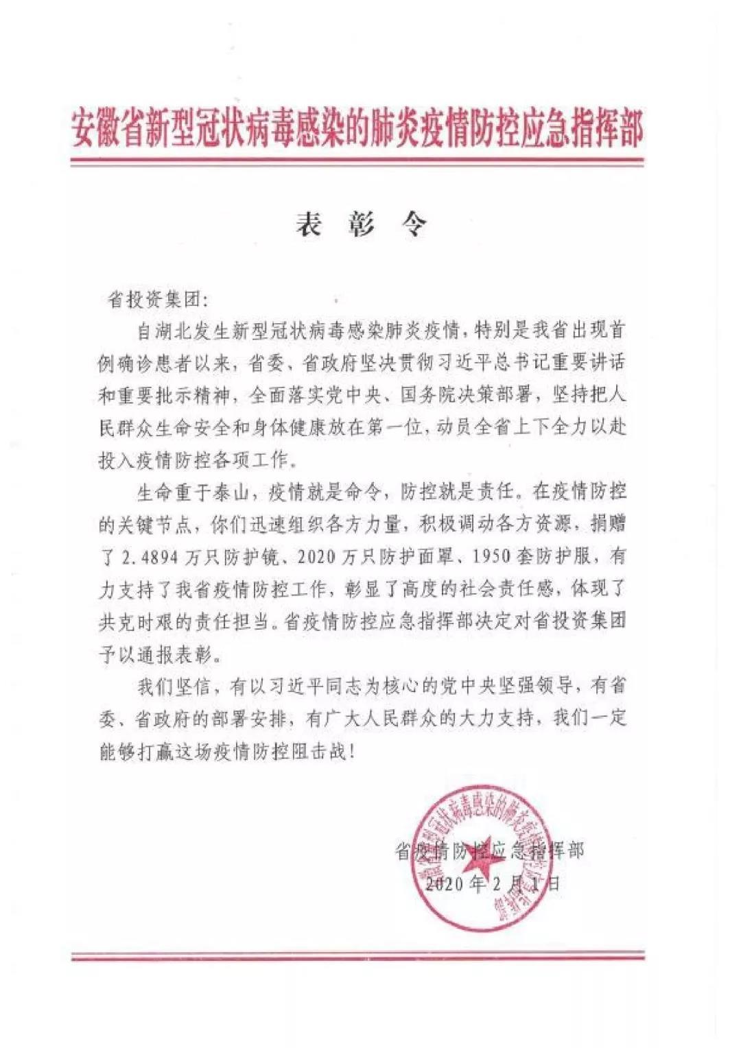 疫情发生以来,集团公司党委认真贯彻落实习近平总书记重要指示批示精神,按照省委、省政府和省国资委决策部署,切实做好自身防控工作的同时,积极协调境外医药用品供应商,紧急采购了一批紧缺医疗防御物资捐赠给省疫情防控指挥办公室,并获得省疫情防控应急指挥部颁发的表彰令。